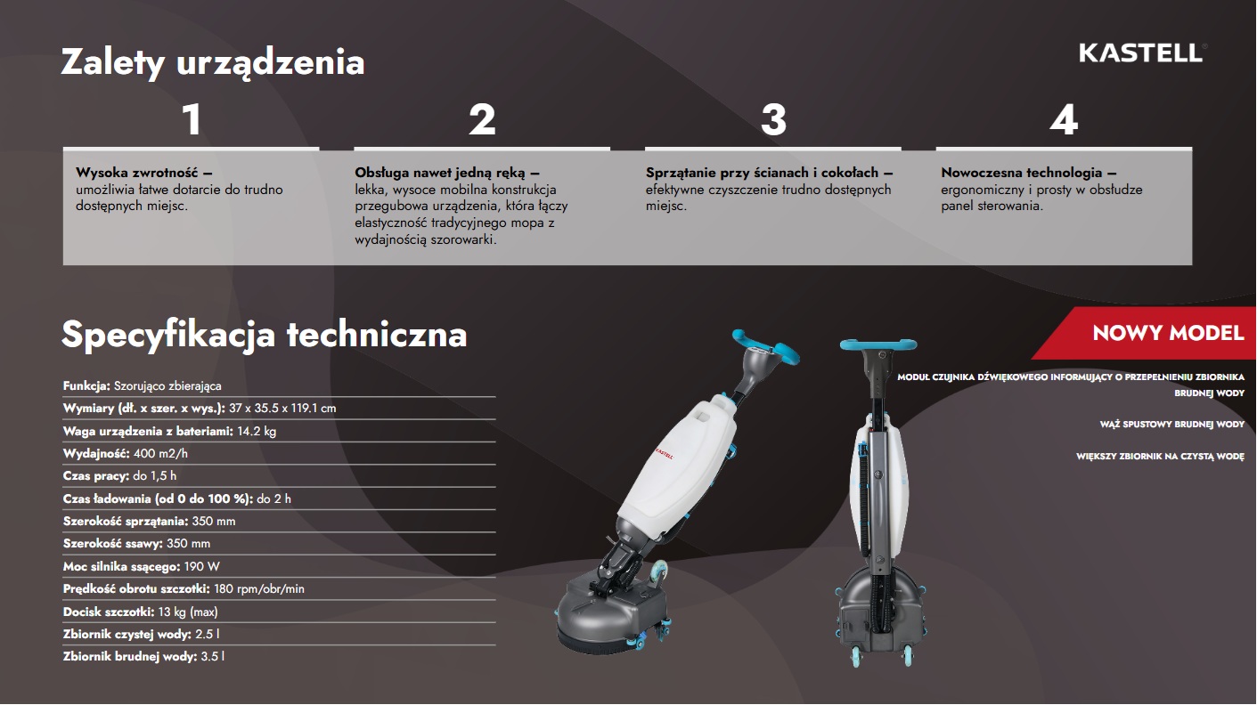 Możliwość sprzątania do 400 m²/h – połączenie wydajności automatu szorująco-zbierającego z elastycznością tradycyjnego mopa, znacząco zwiększa efektywność pracy operatora.